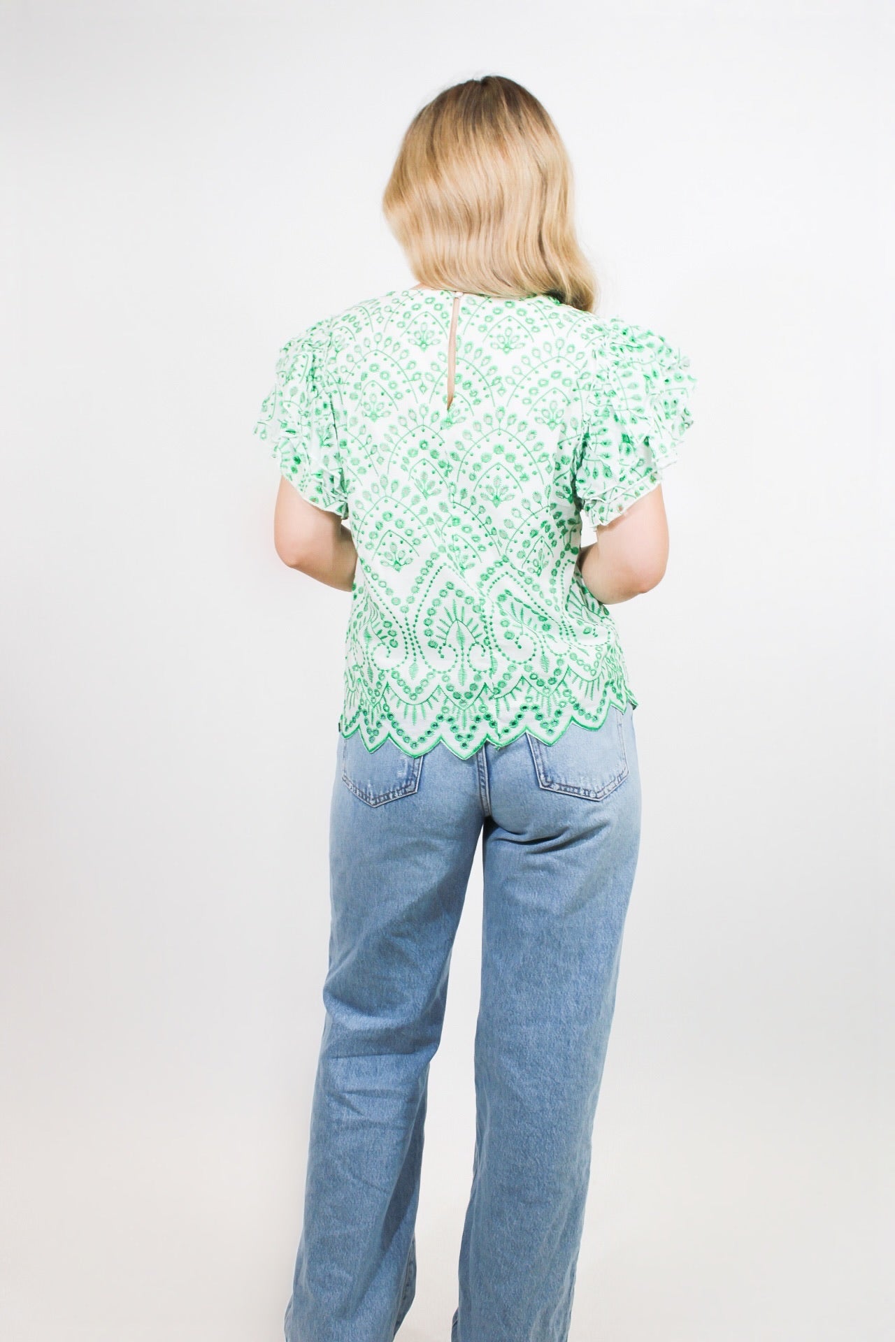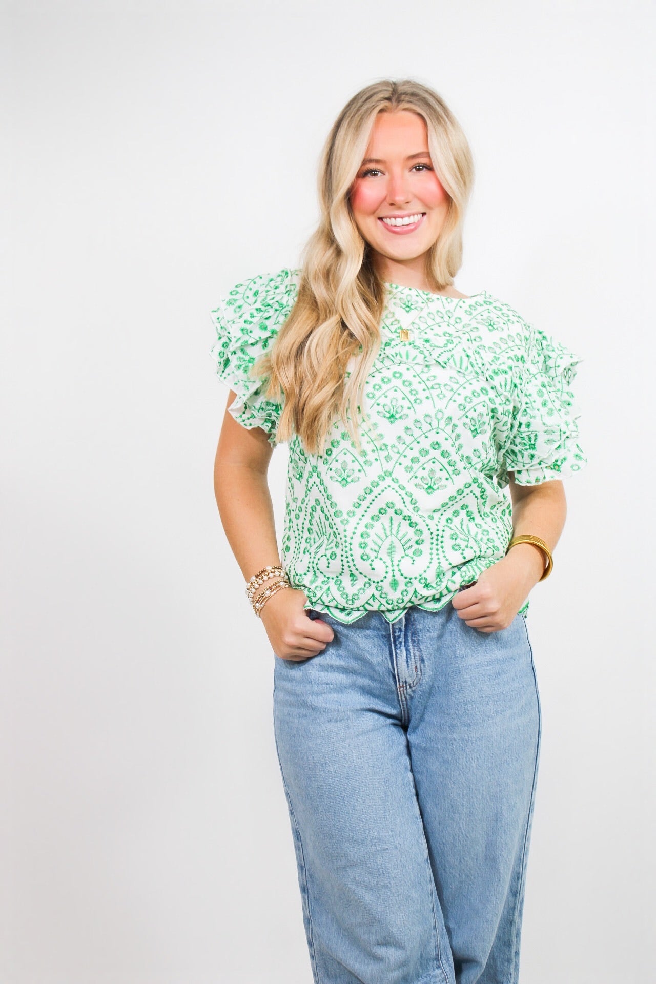 Rachel is 5’3 wearing a size small.Chloe is 5’2 wearing a size small.- Scalloped Trimming.- Ruffled Sleeves.- True to Size.