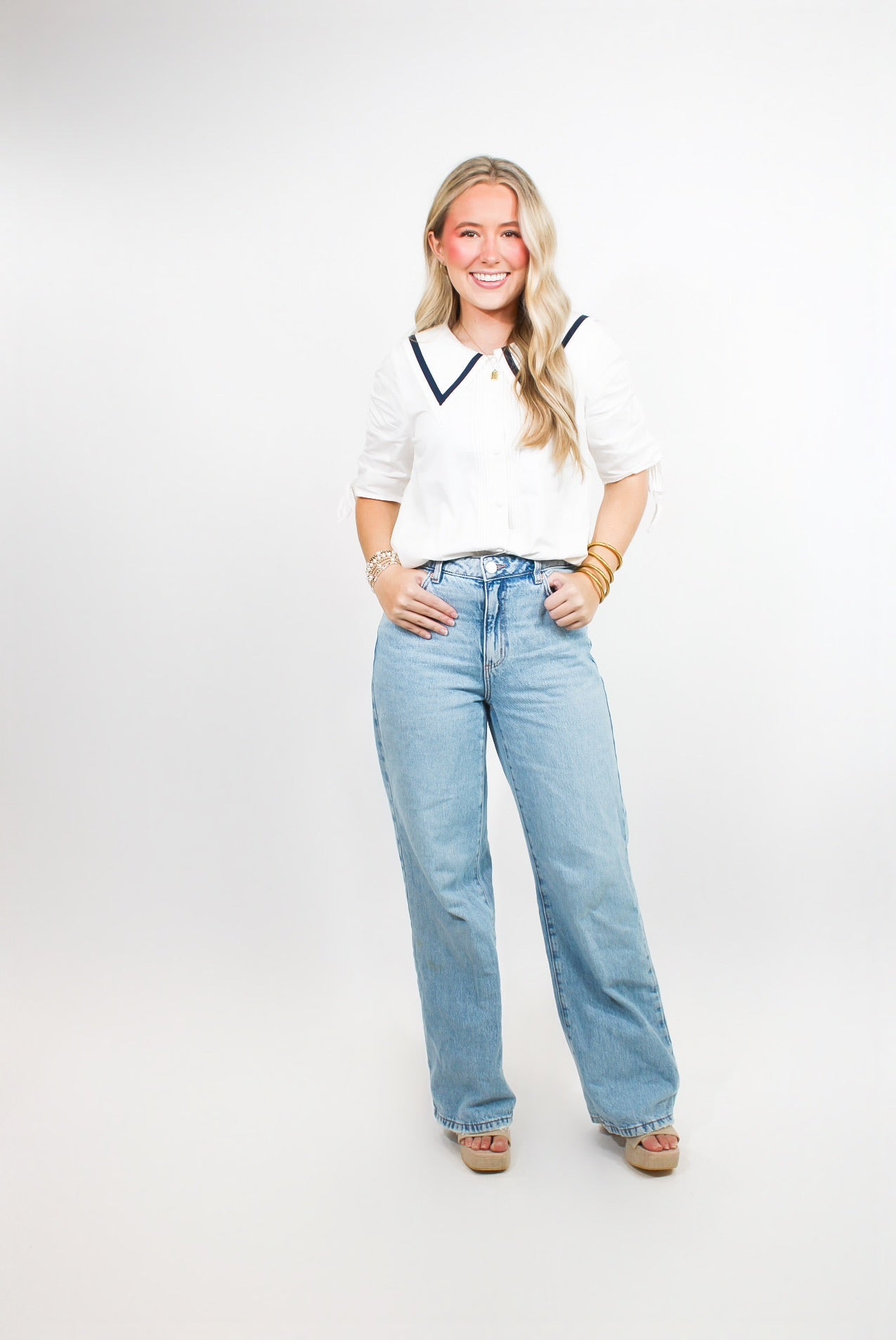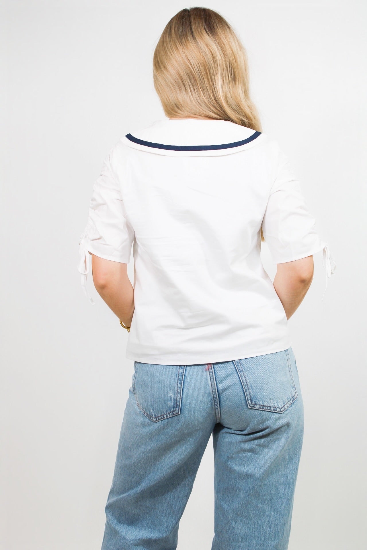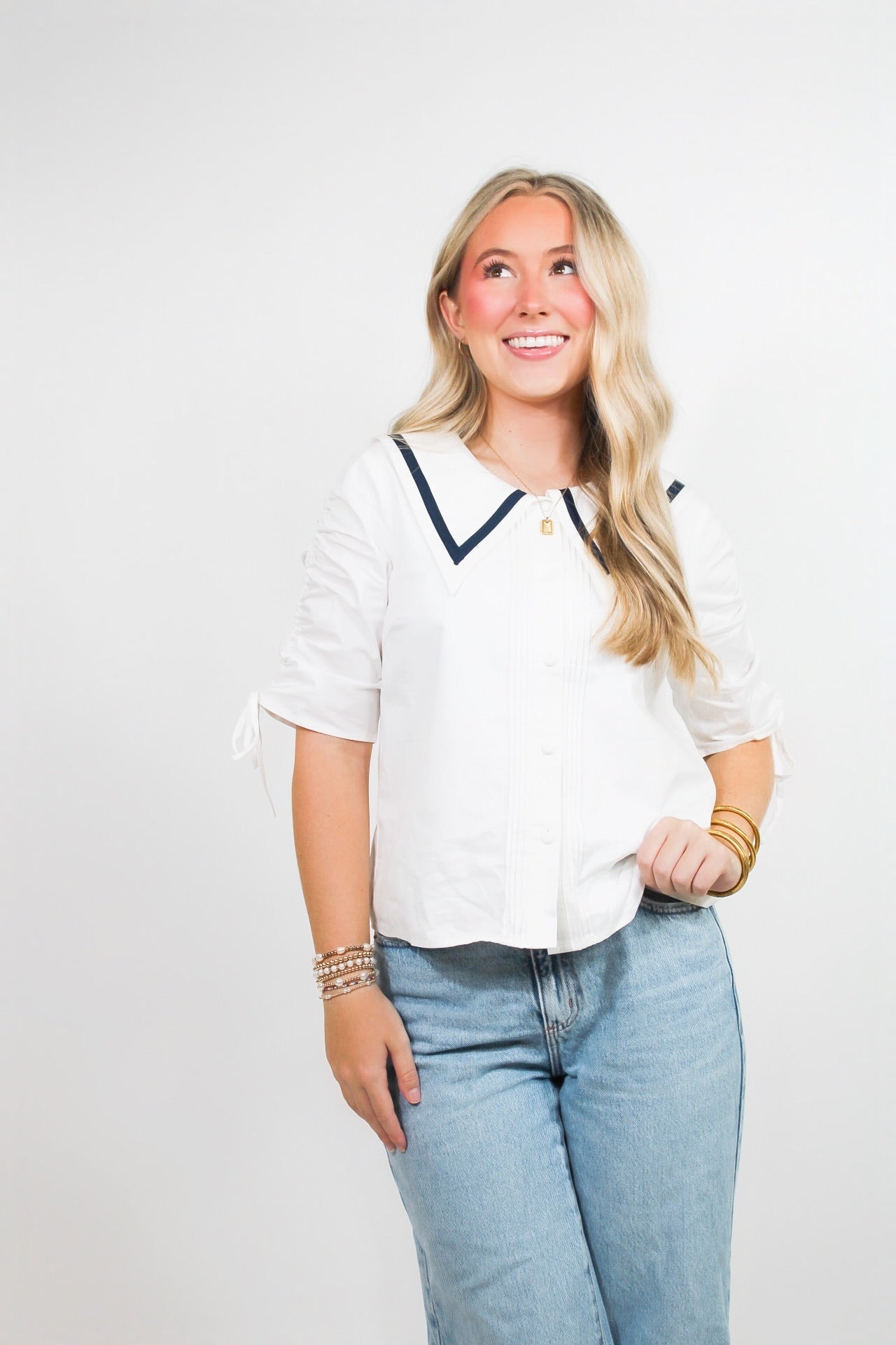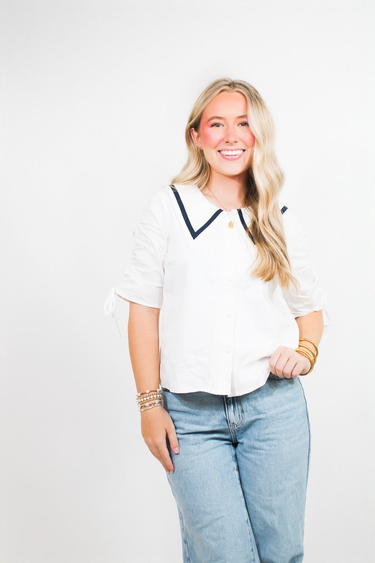 Rachel is 5’3 wearing a size small.- Navy Trimming.- Collared Neckline.- True to Size.