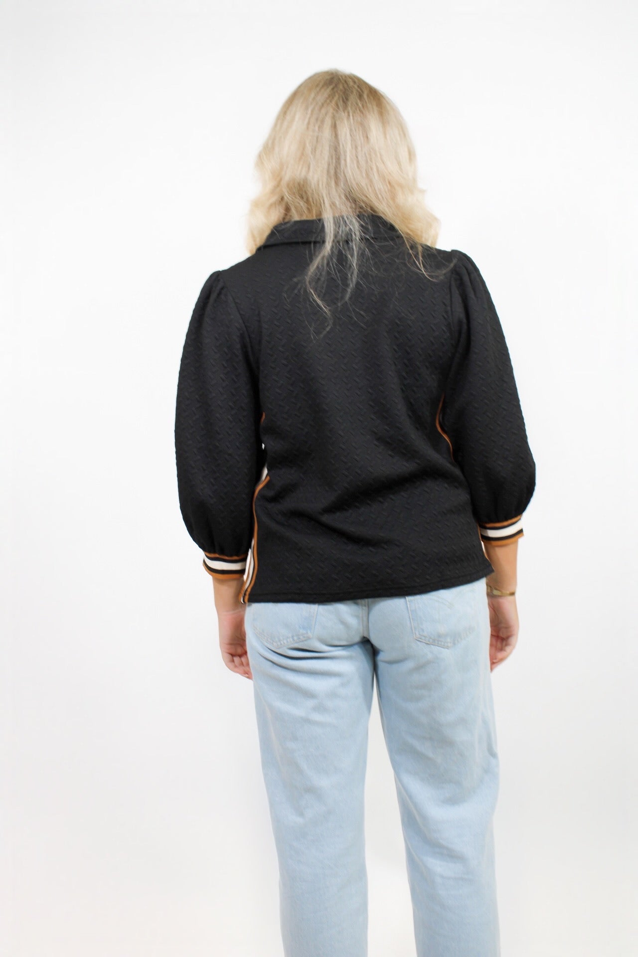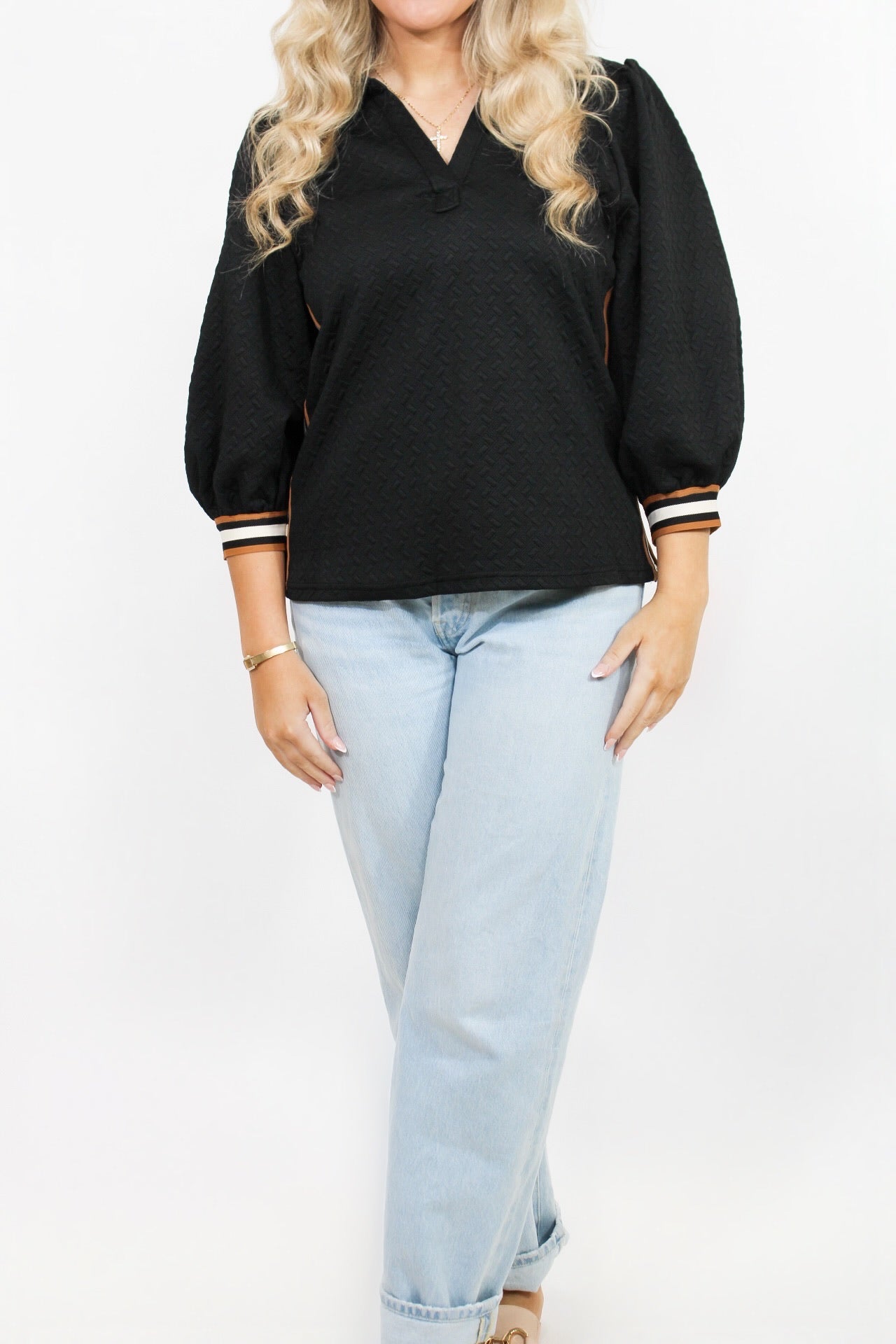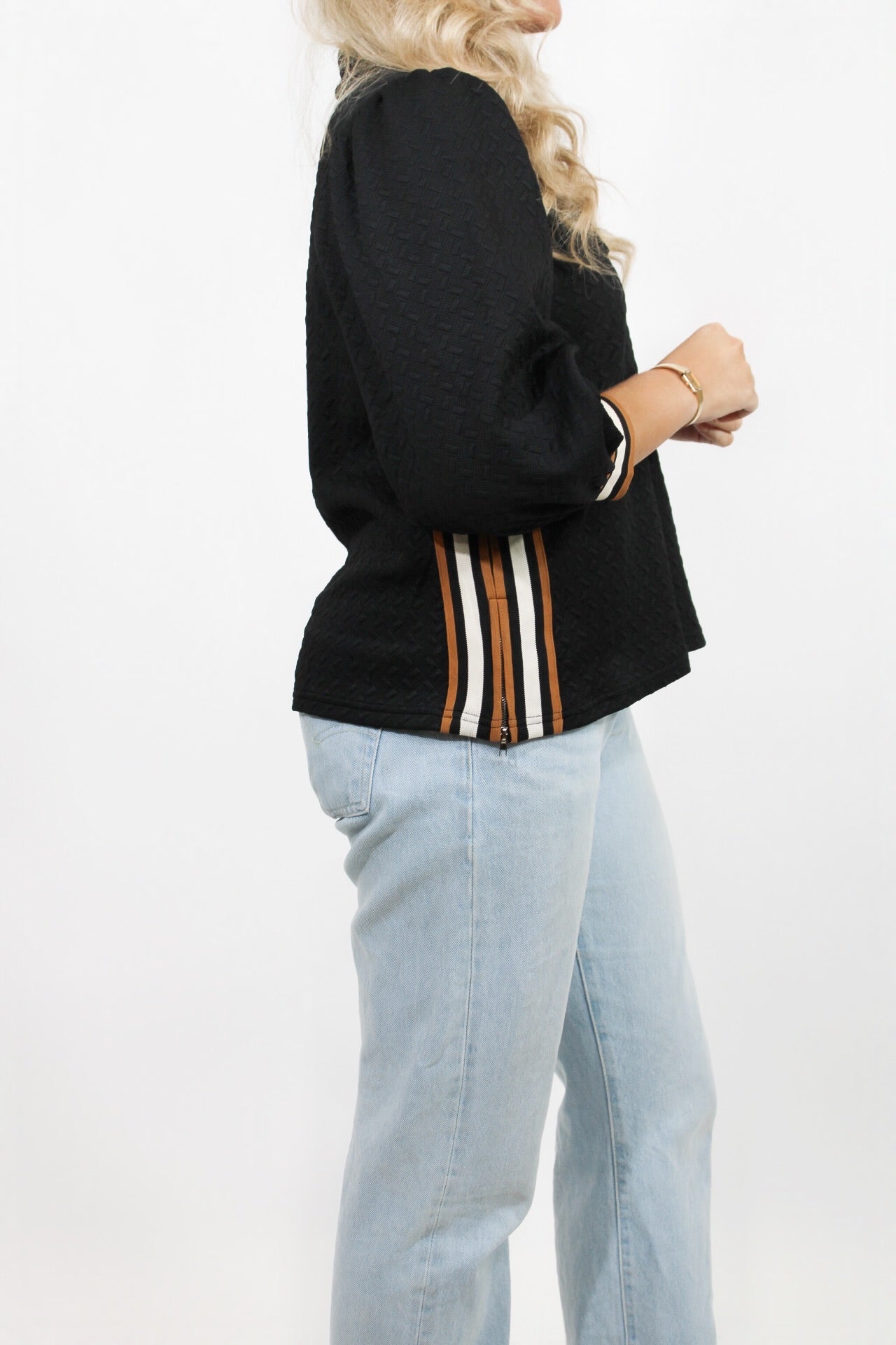 McCall is 5’5 wearing a sizes small.- Collared Top.- Side Zip Detail.- Brown & White Stripe.